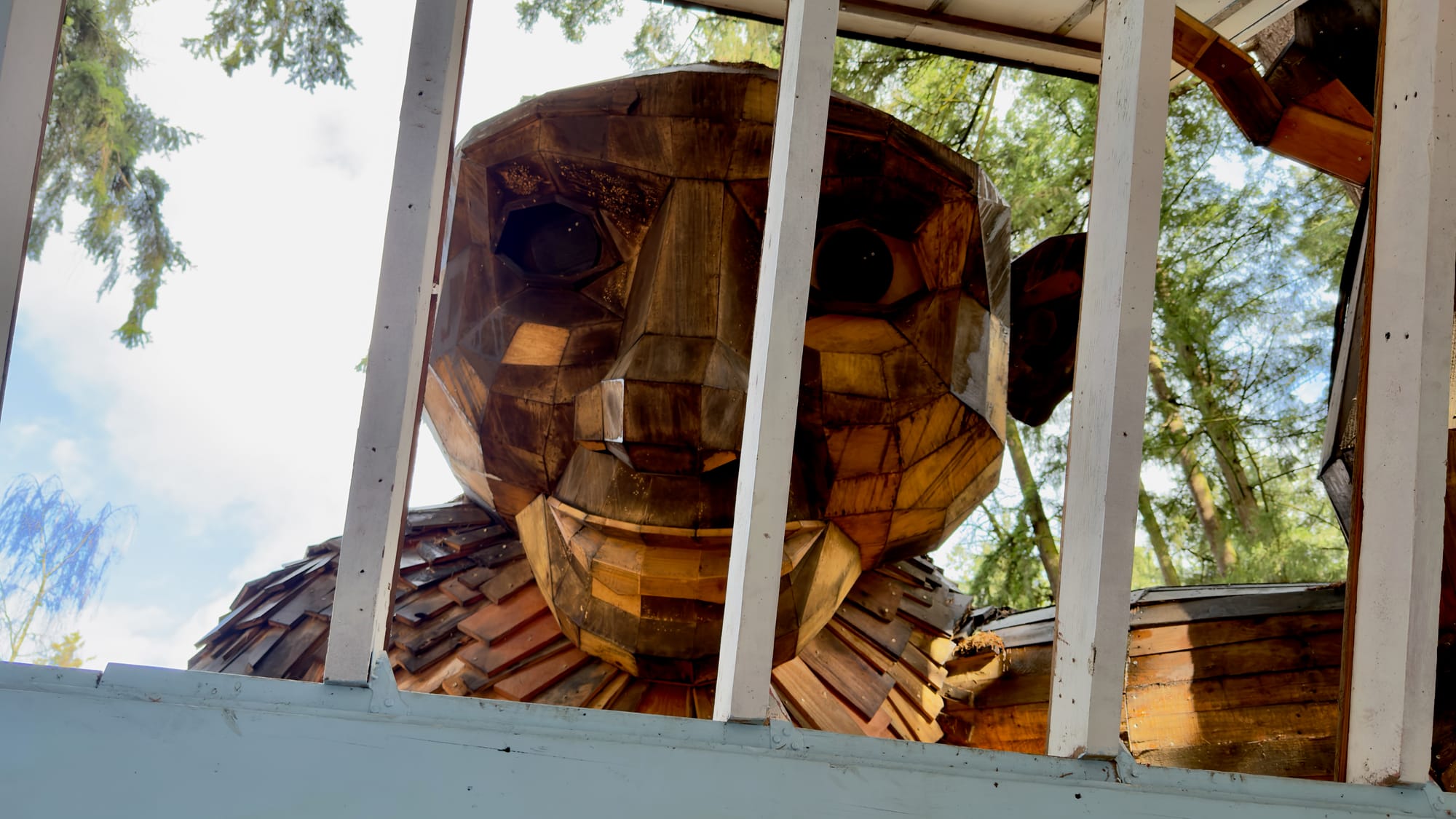 A 19-foot wooden troll sculpture created by artist Thomas Dambo, built from reclaimed materials. Ole Bolle is positioned kneeling and peeking into a small house in the woods, creating a fun interactive photo spot.